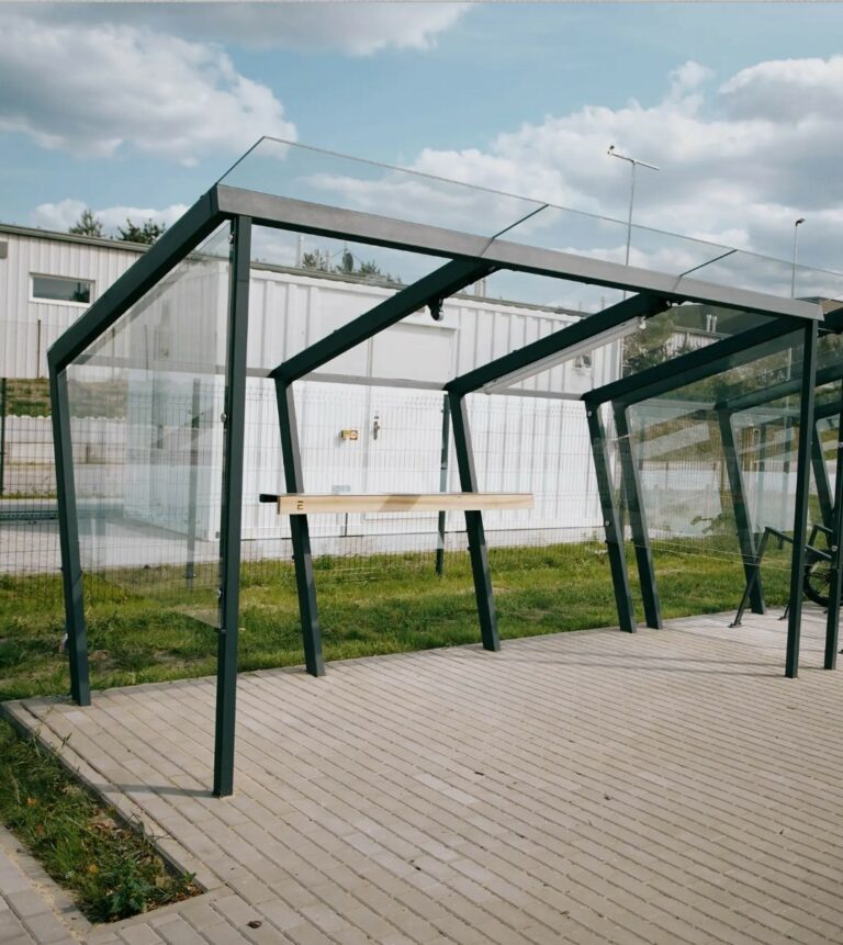 L’abri fumeurs L4170 mm est doté de parois latérales et d’une toiture en verre de sécurité, offrant une protection efficace contre les intempéries tout en laissant circuler la lumière naturelle. Cette conception tout vitrée renforce la visibilité, la sécurité et l’esthétique des zones fumeurs extérieures modernes.