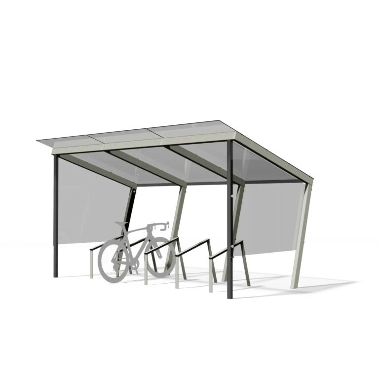 Les parois latérales sont réalisées en verre de sécurité trempé, offrant une protection efficace contre le vent et la pluie tout en garantissant une transparence maximale. Cette conception favorise la surveillance naturelle des vélos, limite les zones opaques et améliore la sécurité des espaces de stationnement cyclable.