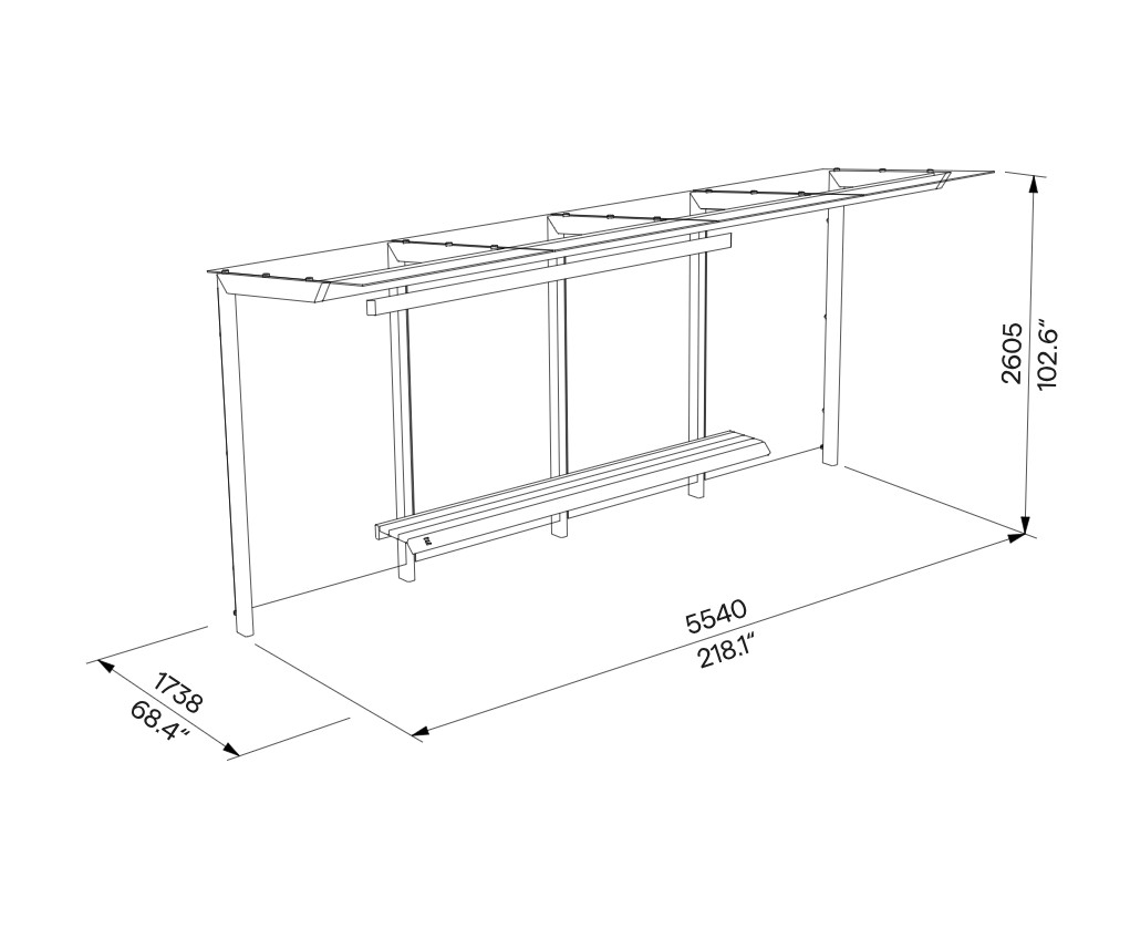 L’abri est équipé d’un banc double en bois intégré, offrant un espace d’assise spacieux et confortable, idéal pour les arrêts de bus à forte fréquentation ou les zones d’attente urbaines très fréquentées.