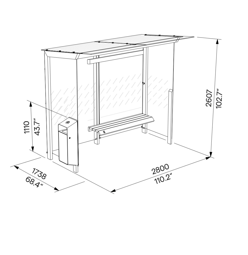 Abribus L2800mm avec banc et corbeille intégrés et parois latérales MONTFERMEIL