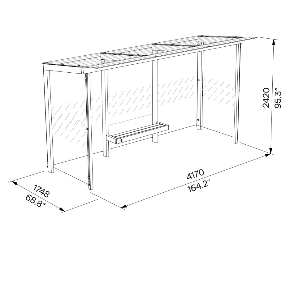 Avec sa longueur de 4270 mm, cet abribus propose un espace d’attente généreux, abrité et bien organisé, idéal pour les zones à fréquentation soutenue. Son design contemporain et épuré facilite une intégration paysagère fluide dans les centres-villes, quartiers résidentiels, zones de circulation et pôles de mobilité.