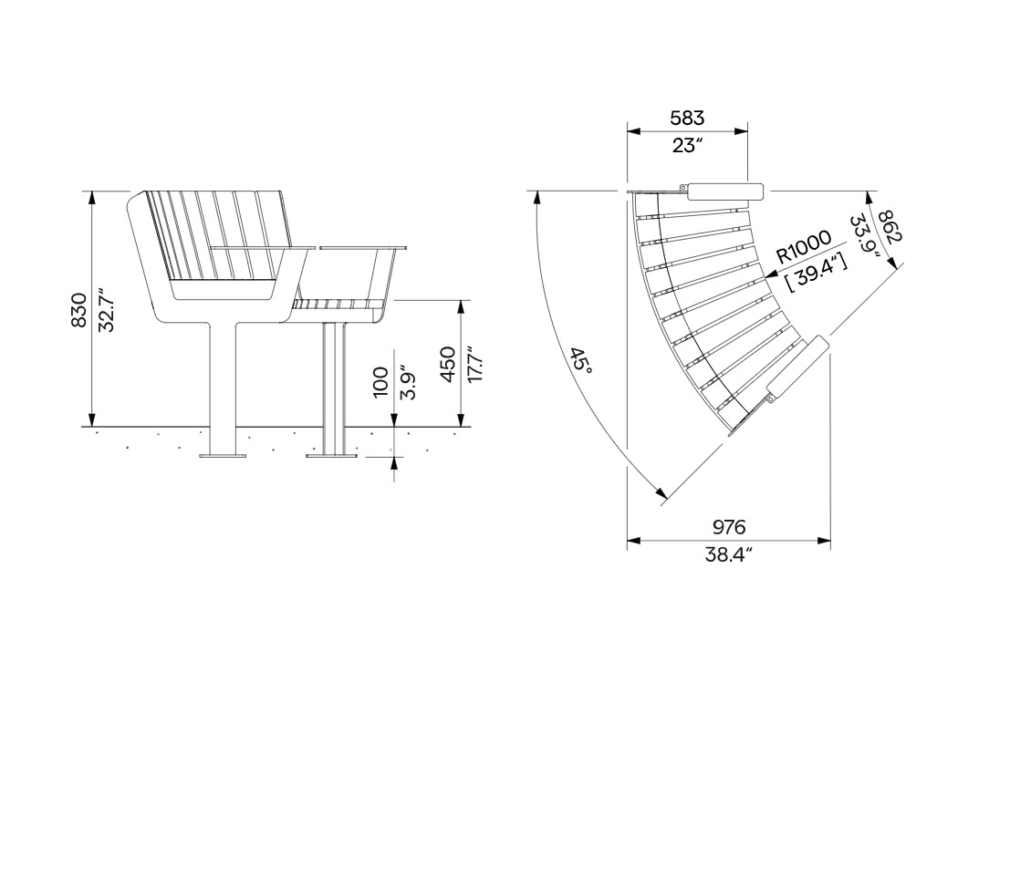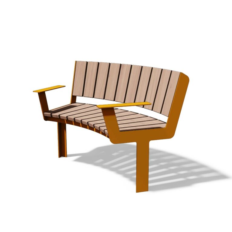 Ce mobilier urbain en bois est doté d’une assise et d’un dossier en bois massif certifié FSC, offrant une esthétique naturelle, chaleureuse et durable. Les accoudoirs intégrés améliorent le confort d’utilisation et facilitent l’assise et le relevé, répondant aux exigences d’accessibilité et de confort dans les espaces publics à forte fréquentation.
