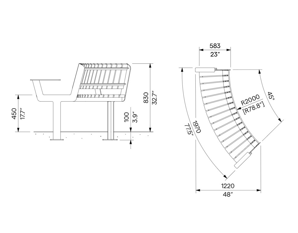 Le banc BLAIN convexe avec accoudoirs est un banc en bois extérieur courbe conçu pour l’aménagement des espaces publics et paysagers. Sa forme convexe, associée à une courbure R2000 sur un angle de 45°, permet de structurer harmonieusement les places publiques, parcs, jardins, esplanades et zones piétonnes, tout en favorisant des implantations circulaires ou semi-circulaires adaptées aux lieux de rencontre.