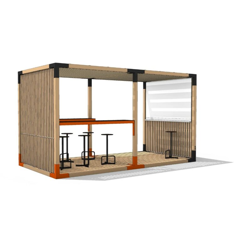 Pensée pour encourager l’interaction, la pergola GRILLON intègre un mobilier adapté au travail collaboratif : tables conviviales, assises fonctionnelles et configurations propices aux réunions informelles. Cet aménagement facilite aussi bien les sessions de travail dynamiques que les moments plus détendus autour d’un café entre collègues ou avec des clients.