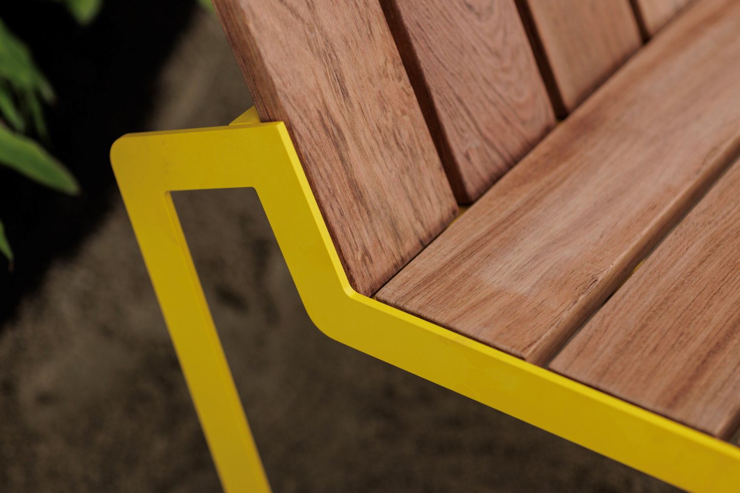 L’assise et le dossier sont réalisés en bois massif certifié FSC, disponibles en thermo-frêne ou jatoba tropical, deux essences reconnues pour leur tenue en extérieur. Une finition huilée est disponible pour valoriser le bois et prolonger sa durabilité.