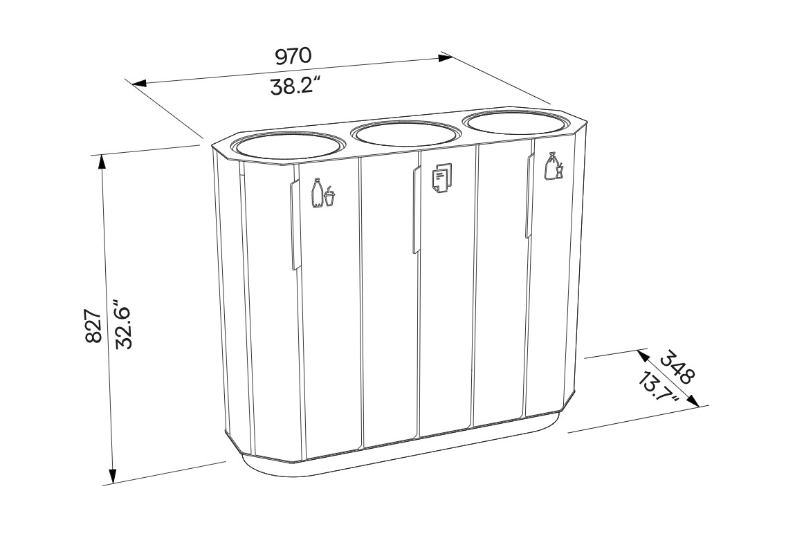 Équipée de trois compartiments de 38 litres chacun (soit une capacité totale de 114 litres), elle permet une séparation nette des différents flux – recyclables, papiers, déchets résiduels – selon les besoins du site.