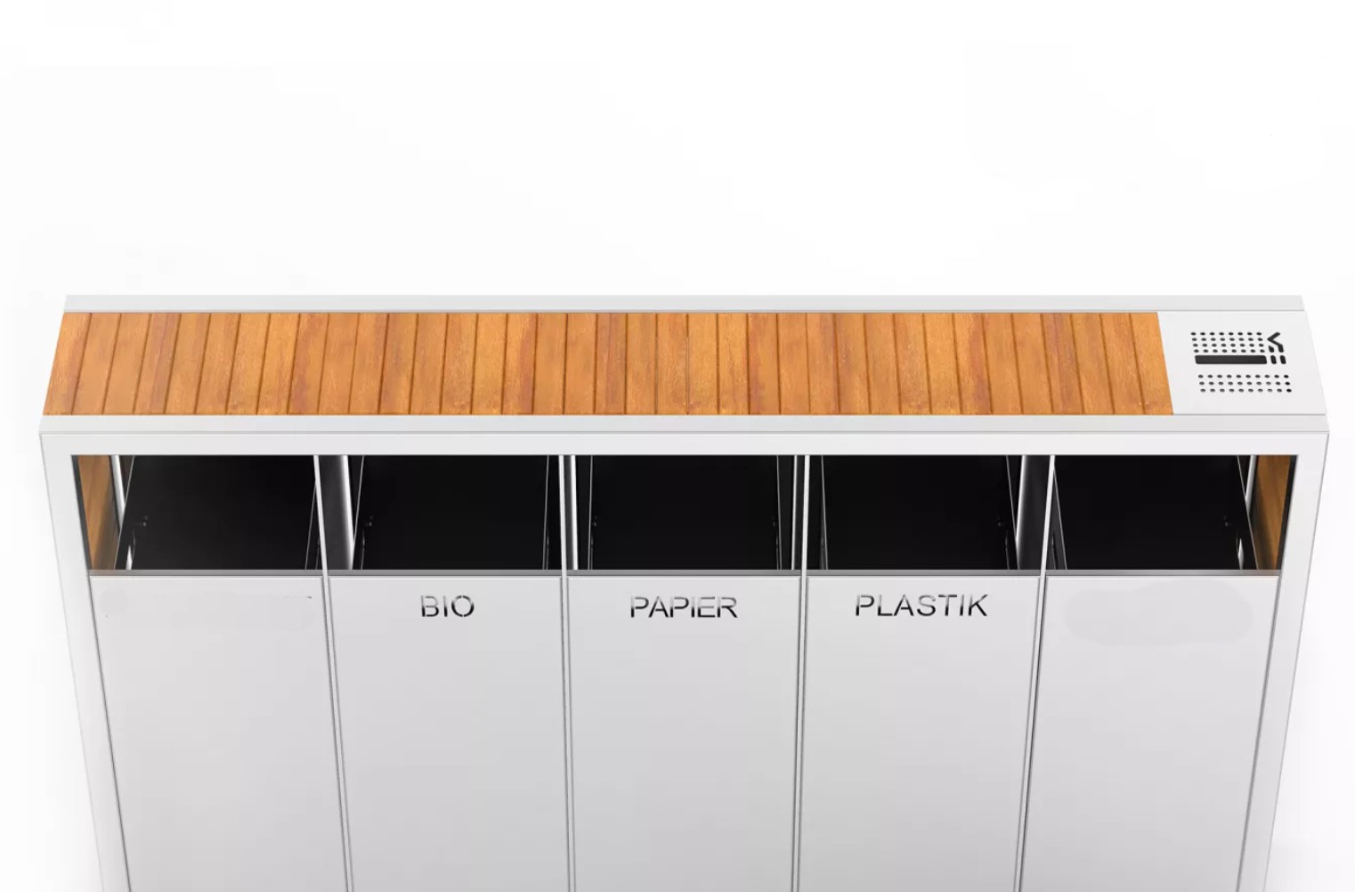 La corbeille de tri sélectif Pav est disponible en acier carbone galvanisé peint (selon nuancier RAL)  ou en acier inoxydable avec un habillage en bois (différentes essences sont disponibles). Cette corbeille est aussi proposée avec un cendrier et se décline en corbeille simple. La contenance de chaque corbeille Pav est de 50 litres.