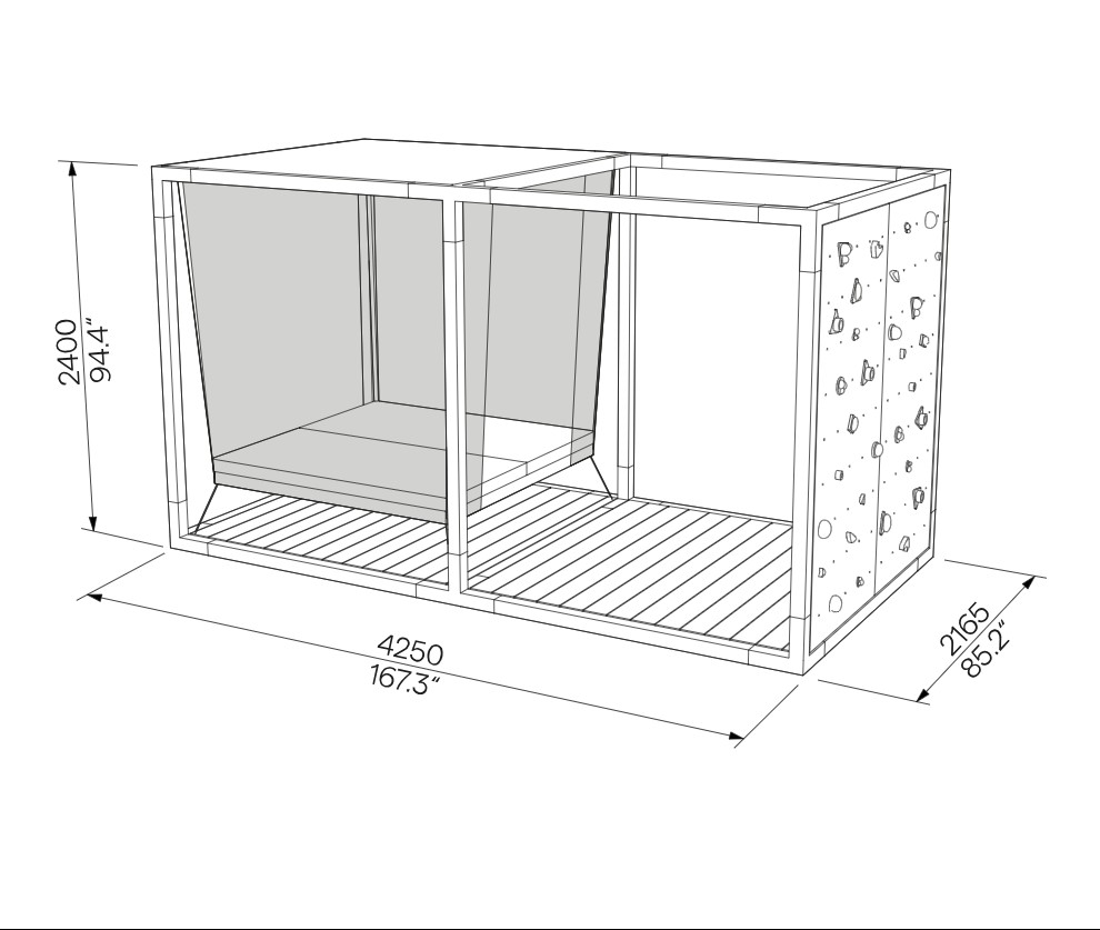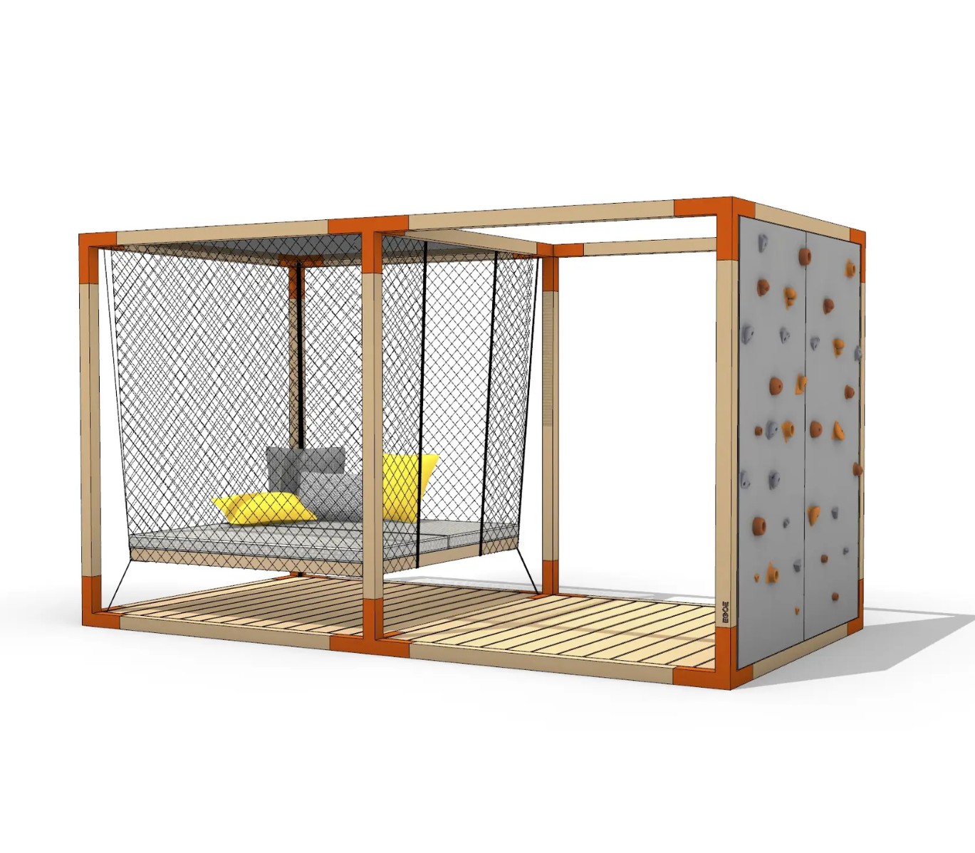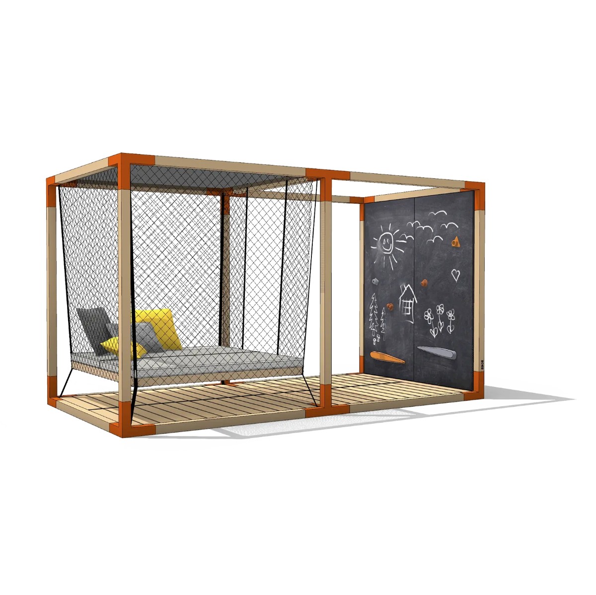 Véritable cocon en plein air, la pergola PUGET abrite un lit suspendu doucement bercé sous l’ombrage de la structure, invitant à la détente. Un grand tableau noir laisse libre cours à la créativité, tandis qu’un mur d’escalade en partie extérieure propose une activité ludique complémentaire, favorisant mouvement et moments partagés.