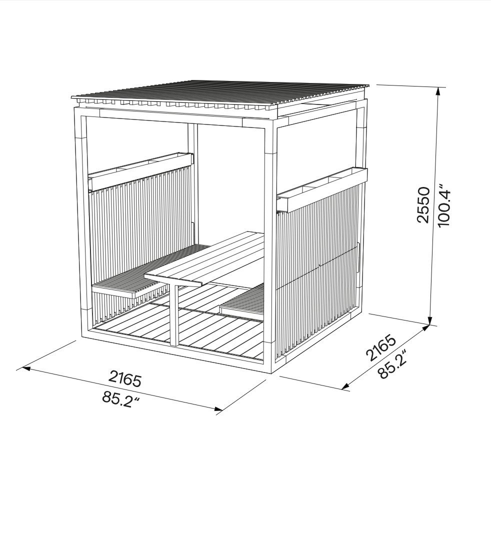 La pergola PERTUIS comprend également un coin banc et table intégré, formant un ensemble fonctionnel et accueillant. Cette configuration optimise l’espace disponible et favorise les rencontres informelles, que ce soit dans un cadre professionnel ou résidentiel.