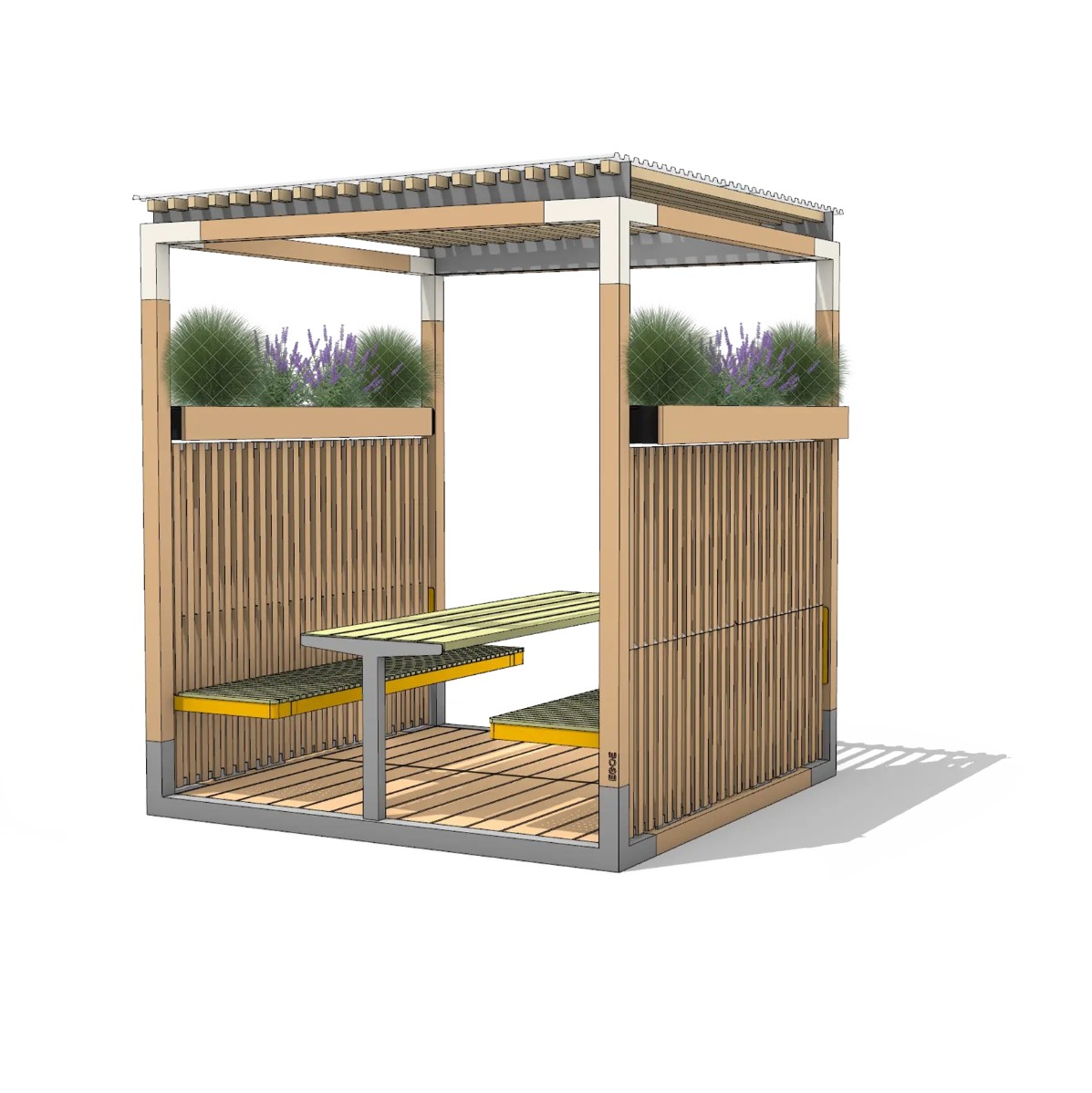 Sur le plan technique, la structure est proposée en bois massif européen FSC de Mélèze ou en acier galvanisé à chaud, assurant solidité, stabilité et résistance face aux conditions climatiques. Les éléments en bois certifié FSC contribuent à l’esthétique naturelle de l’ensemble tout en répondant aux exigences des projets d’aménagement extérieur durable.