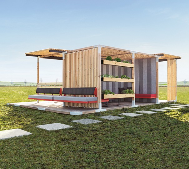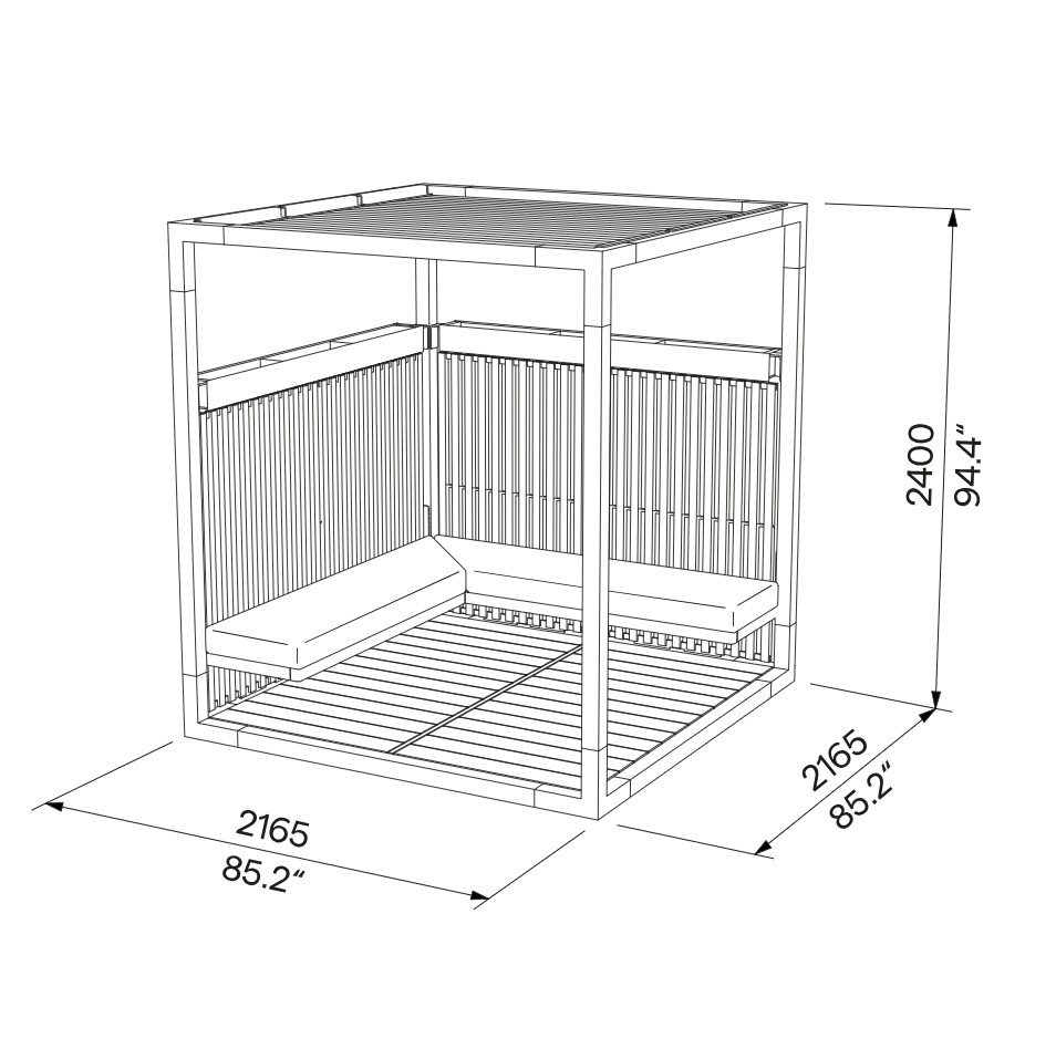 Sa conception met à l’honneur le bois de Mélèze certifié FSC, garantissant durabilité, résistance naturelle aux intempéries et engagement responsable. Le toit en lames de Mélèze FSC filtre la lumière tout en assurant une protection efficace, créant une atmosphère à la fois lumineuse et apaisante.