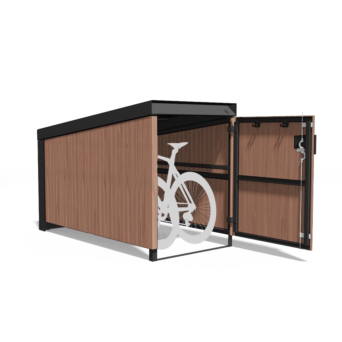 Les portes et parois latérales sont habillées de bois massif certifié FSC, disponible en thermo-frêne européen ou en bois tropical, avec finition naturelle ou traitement à l’huile de teck. La paroi arrière en tôle pliée et la toiture en tôle nervurée renforcée assurent une protection efficace contre les intempéries. Cette combinaison bois et acier confère à l’abri un design contemporain, idéal pour les centres-villes, quartiers résidentiels, sites patrimoniaux et projets immobiliers haut de gamme.