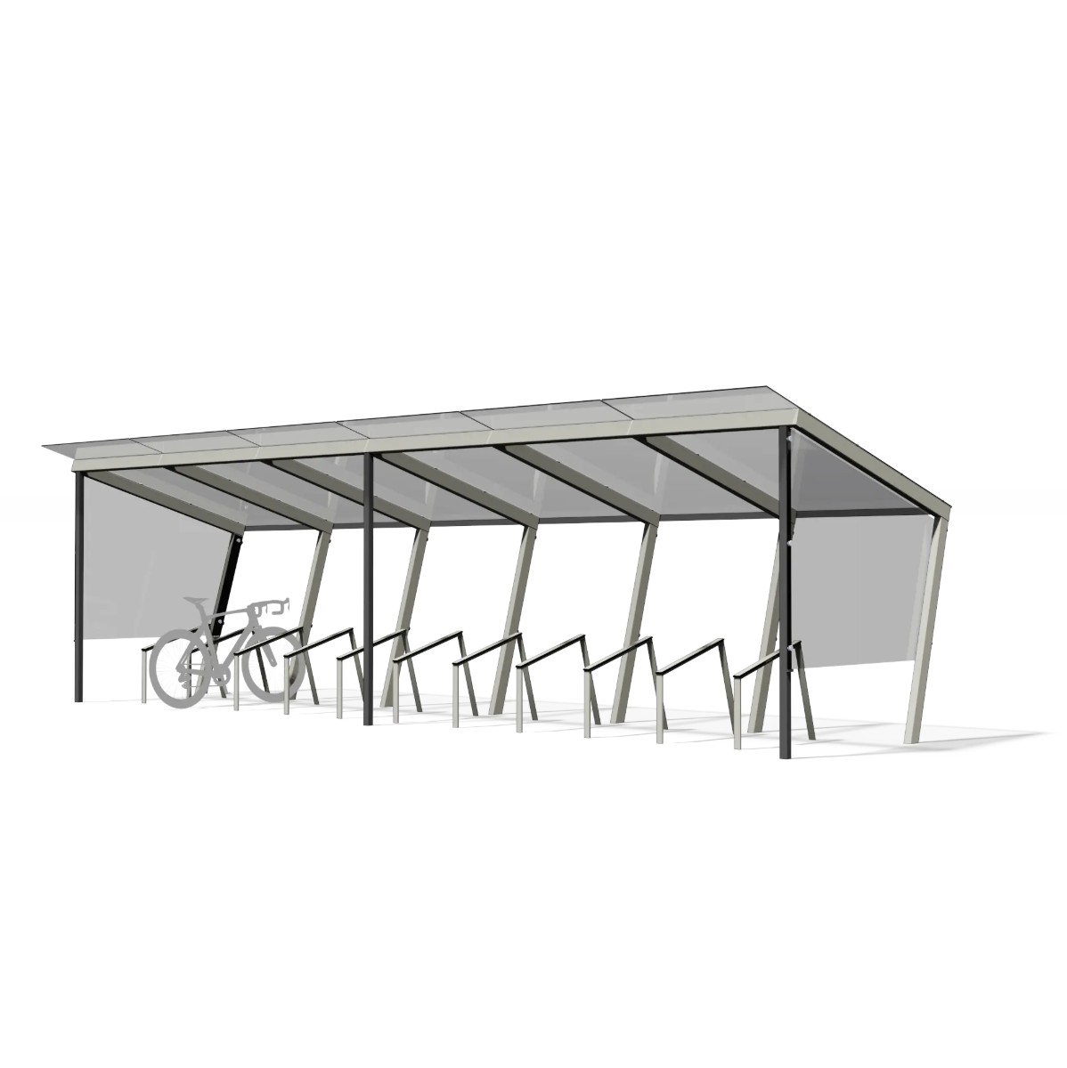 Les parois latérales sont constituées de verre de sécurité trempé, offrant une protection efficace contre le vent et les projections tout en conservant une transparence élevée. Cette configuration améliore la sécurité passive, limite les zones masquées et s’intègre harmonieusement aux espaces publics et zones de stationnement vélo.