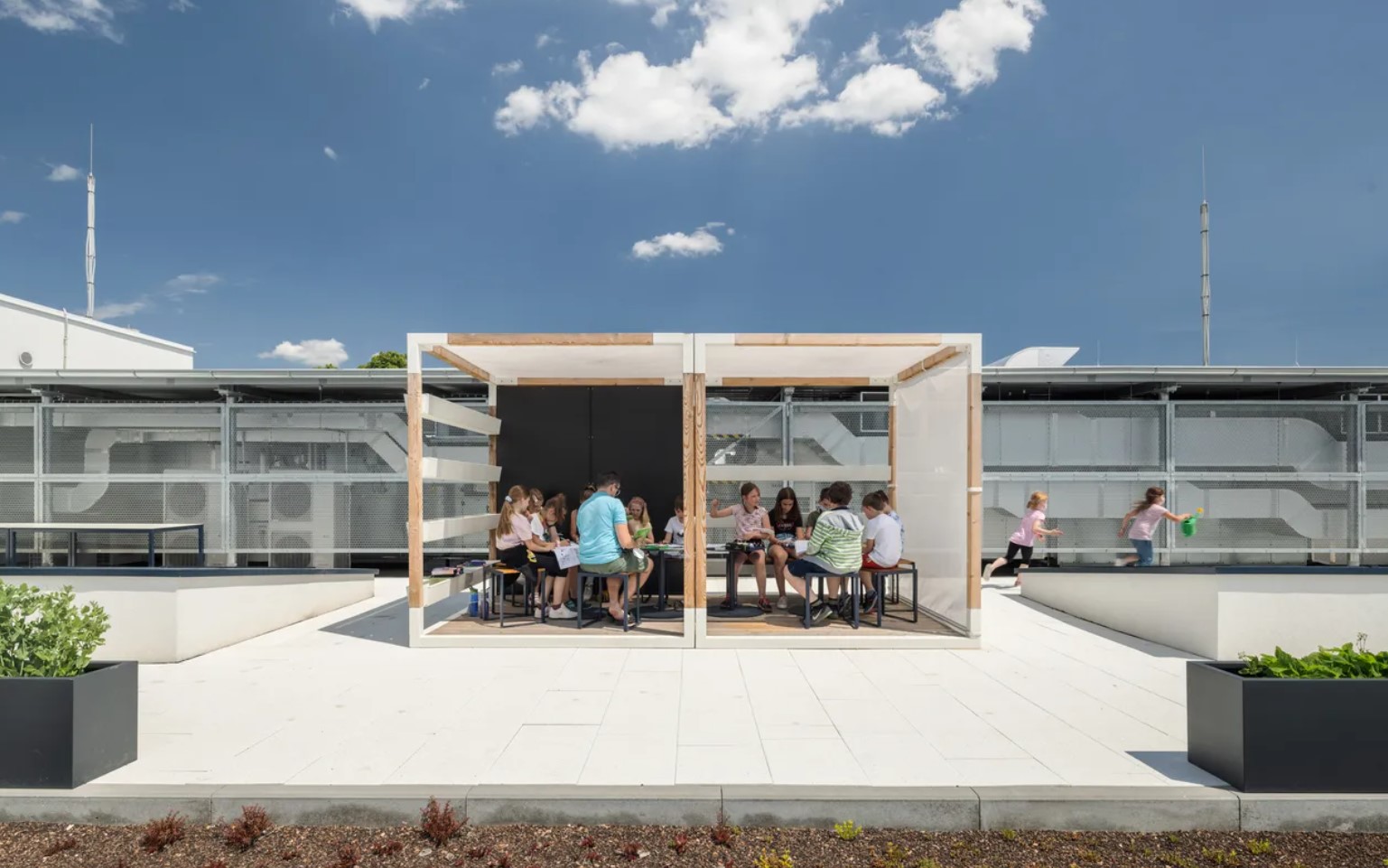 Issue du concept modulaire LEVA, la pergola s’adapte aux besoins spécifiques de chaque établissement. Son système évolutif permet de configurer la surface, l’implantation et les équipements selon les contraintes du site, qu’il s’agisse d’une cour d’école, d’un parvis de lycée ou d’un espace universitaire paysager.