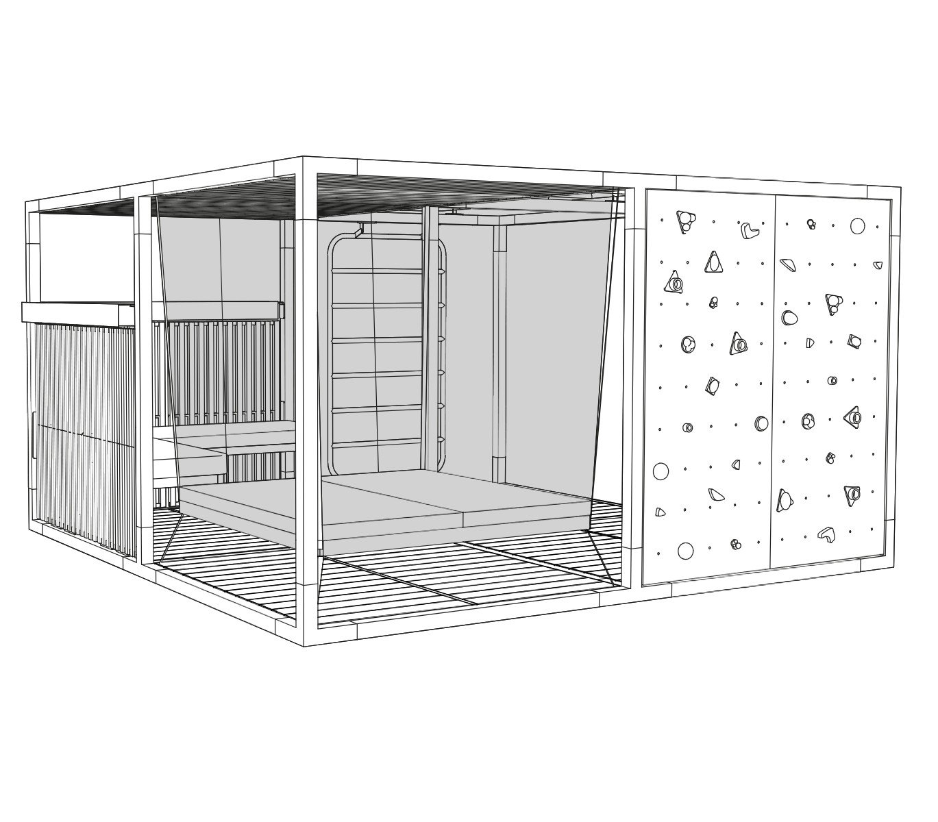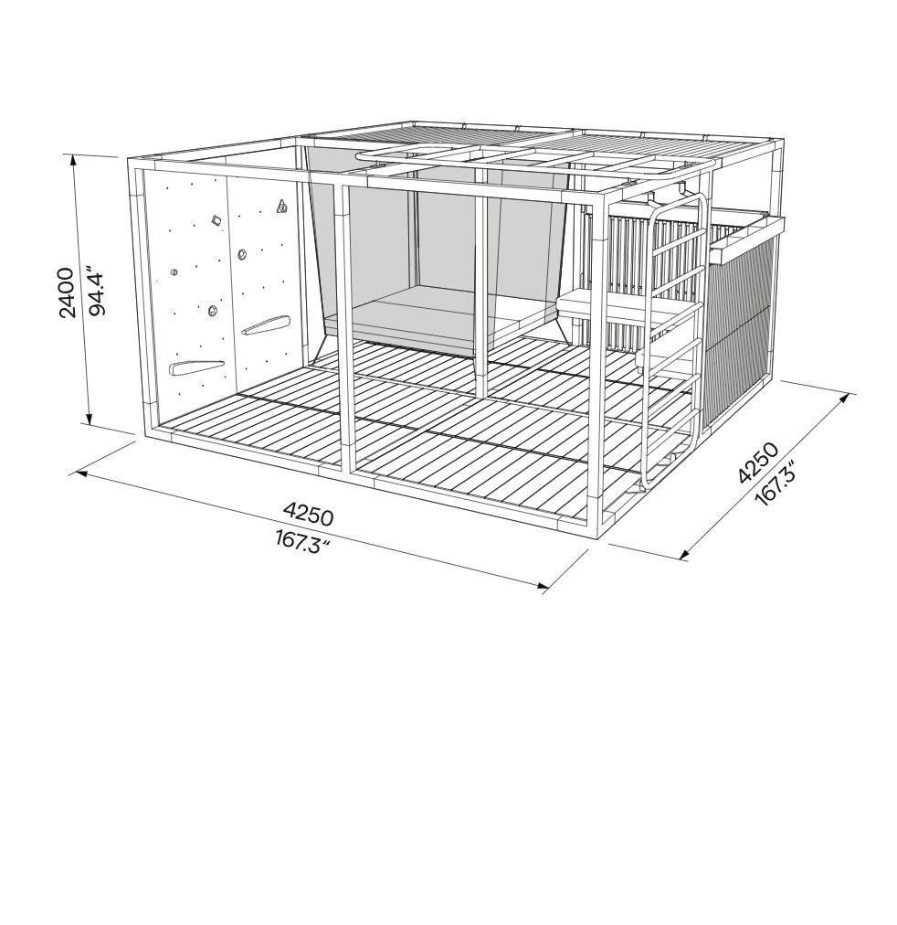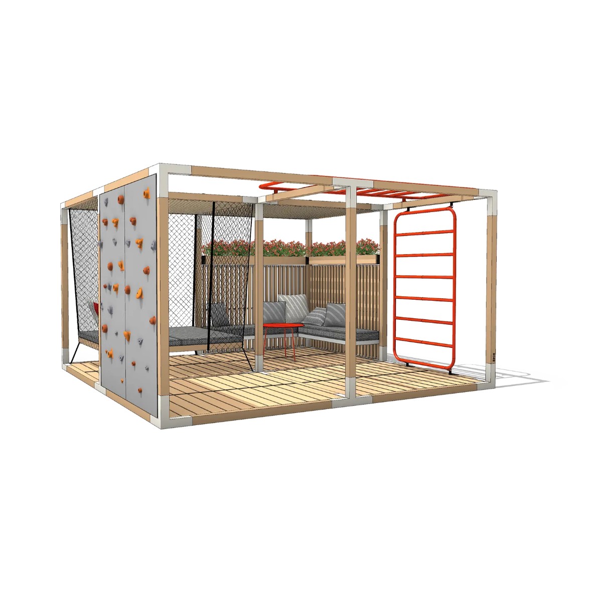 L’aménagement intègre un lit suspendu, véritable invitation à la déconnexion, idéal pour les établissements hôteliers recherchant une expérience premium. Des banquettes confortables complètent l’ensemble et créent un espace lounge extérieur propice aux moments de calme ou aux échanges informels. Pour les environnements tertiaires ou touristiques, des agrès sportifs intégrés apportent une dimension dynamique, favorisant le bien-être et l’activité physique en plein air.
