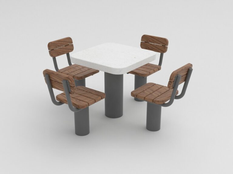 Cet ensemble de table avec chaises est constitué d’un plateau en béton HPC (béton haute performance) et d’un pied central en acier galvanisé peint par poudrage ou en acier inoxydable. Les chaises sont composées d’un support en acier galvanisé peint par poudrage et d’une assise avec dossier en bois. Un plateau de jeu d’échecs peut être ajouté en option.